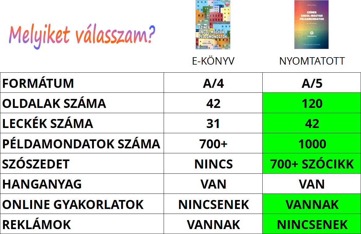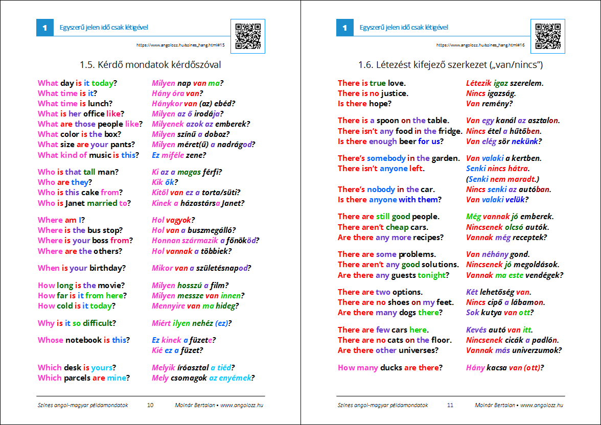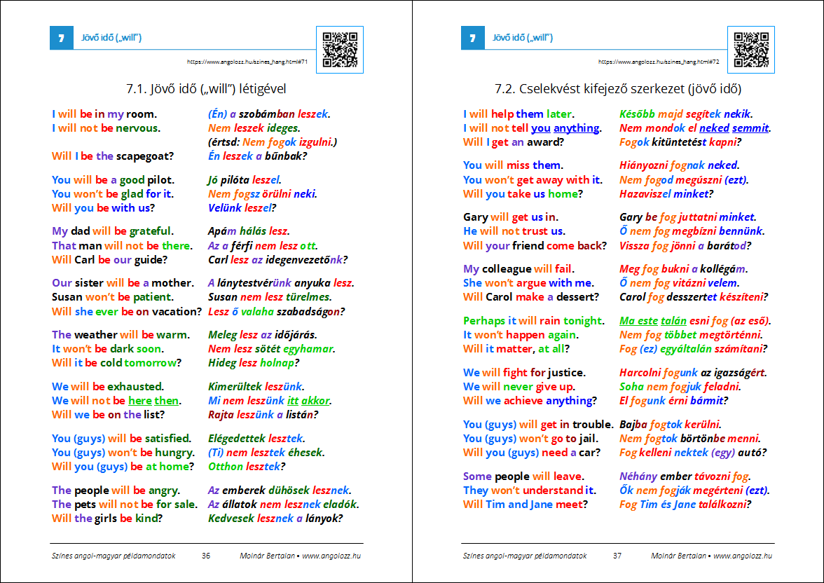 Mindenesetre nyelvtani magyarázatok nélkül is jó hasznát tudod venni az anyagnak, hiszen megtalálod a magyar fordítást minden egyes angol példamondat mellett, a színezés pedig segít megérteni a szerkezeteket.