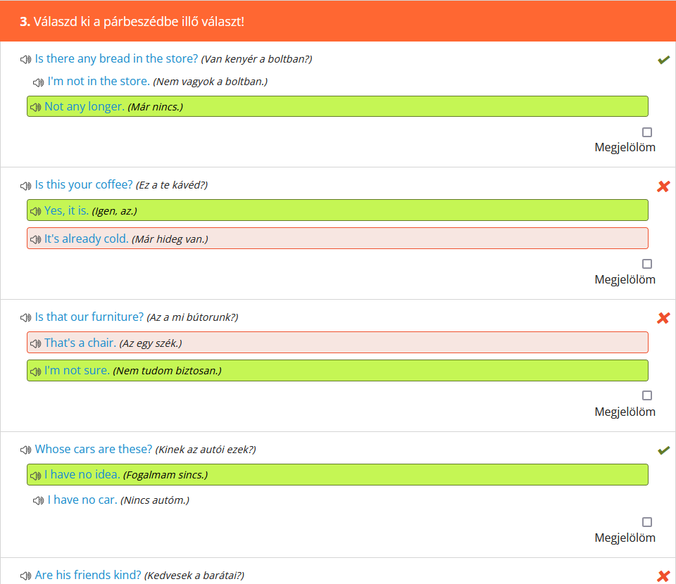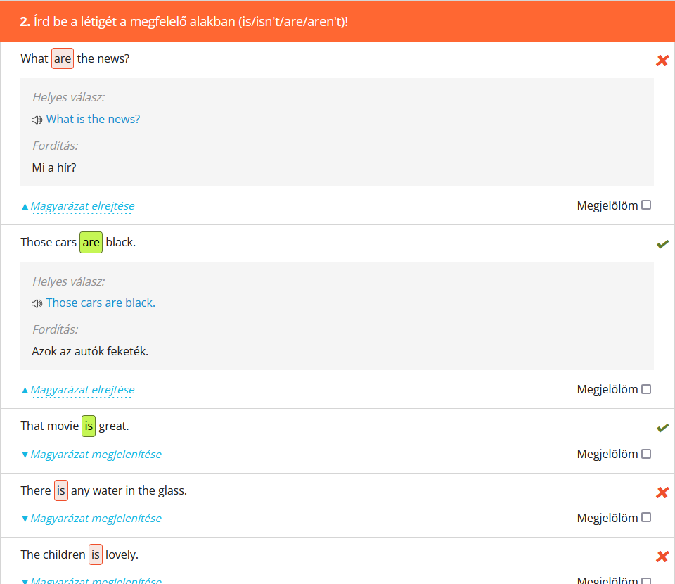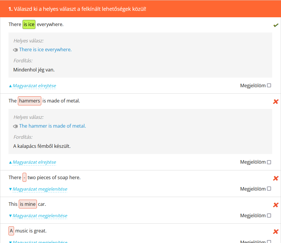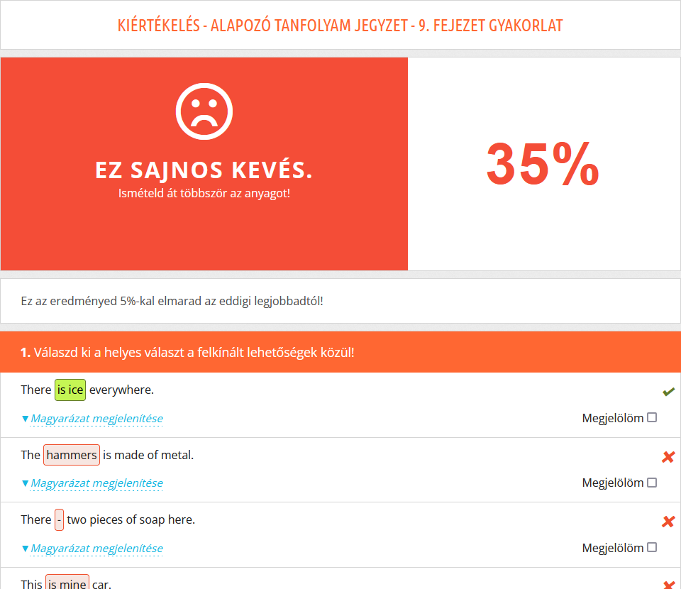 Fontos megemlíteni, hogy a gyakorlatok kiértékelésének alapos áttekintése legalább olyan fontos - ha nem fontosabb -, mint maga a kérdéssor kitöltése, hiszen itt tudhatod meg, mit rontottál el, illetve a fordításokból kiderül, hogy pontosan értetted-e az adott példában szereplő mondatot, nem beszélve arról, hogy meg is tudod hallgatni az angol mondatot. Érdemes tehát rászánni ezekre az időt! |