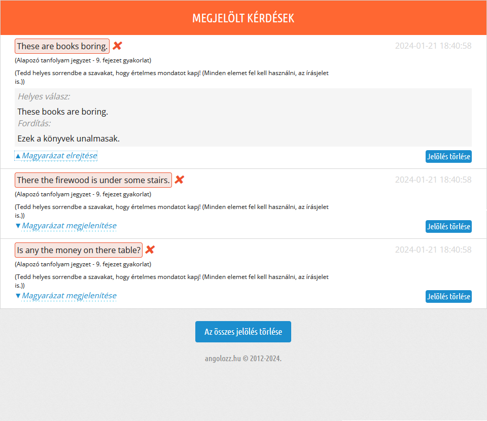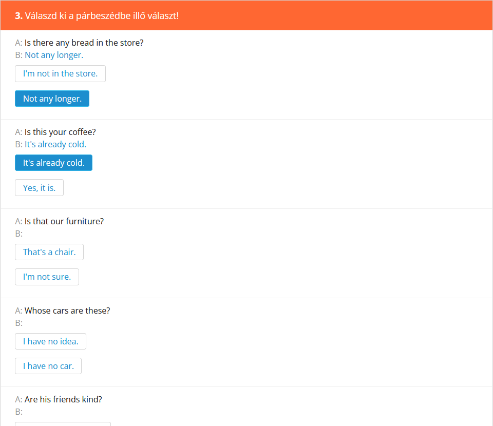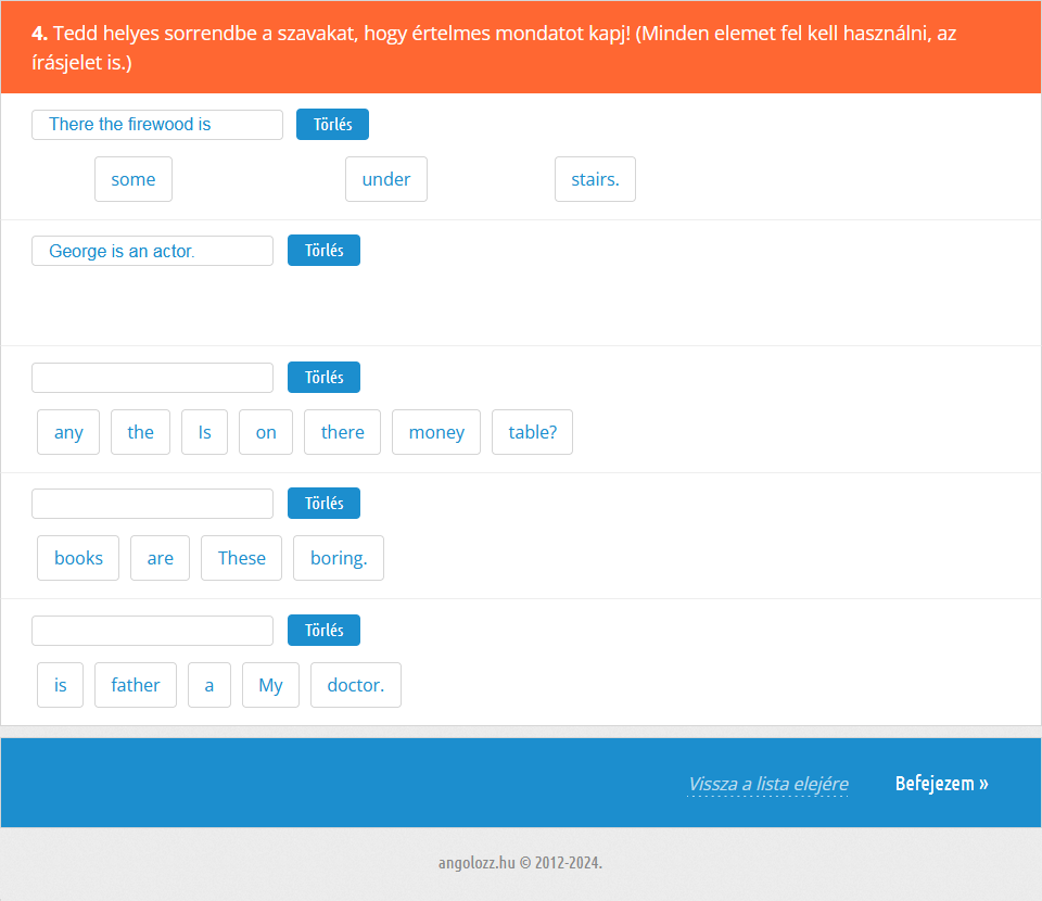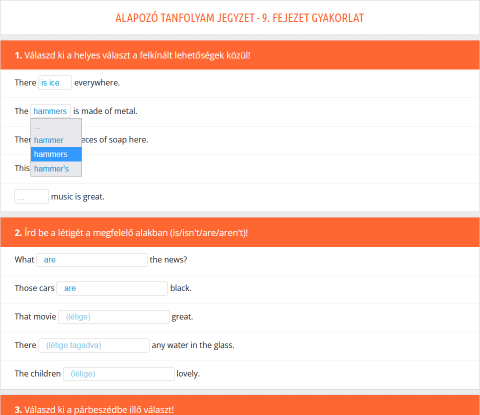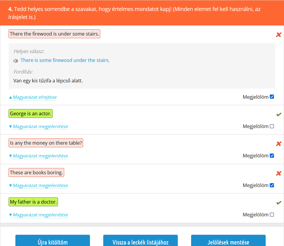 Fontos megemlíteni, hogy a gyakorlatok kiértékelésének alapos áttekintése legalább olyan fontos - ha nem fontosabb -, mint maga a kérdéssor kitöltése, hiszen itt tudhatod meg, mit rontottál el, illetve a fordításokból kiderül, hogy pontosan értetted-e az adott példában szereplő mondatot, nem beszélve arról, hogy meg is tudod hallgatni az angol mondatot. Érdemes tehát rászánni ezekre az időt! |
